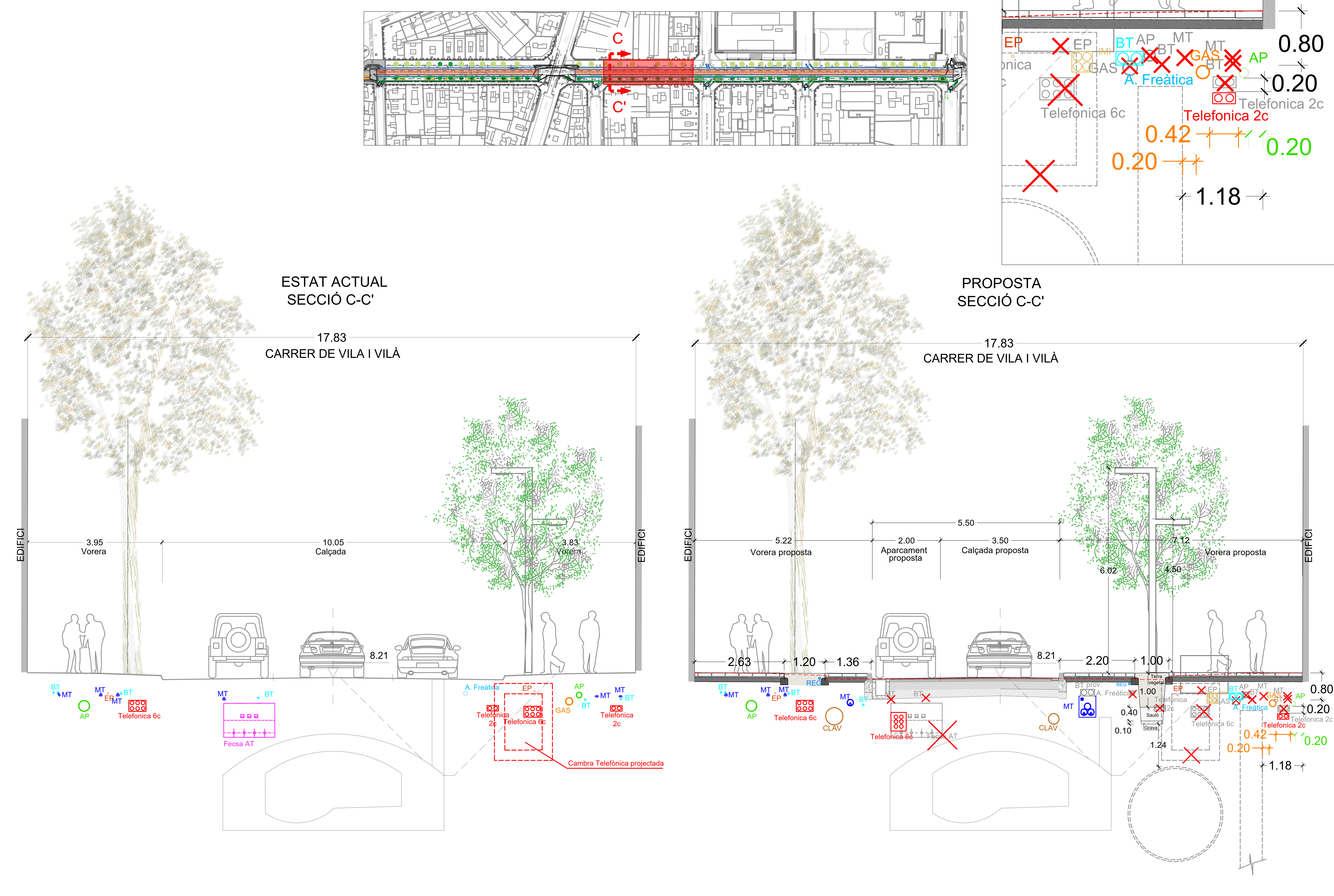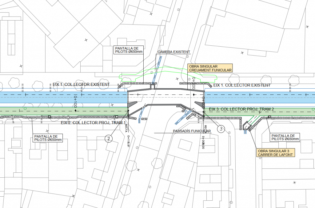 Por otro, el encaje de la infraestructura en un entorno físico urbano limitado y altamente denso y consolidado, con presencia en el subsuelo de infraestructura de transporte (Funicular de Montjuïc y pasillo de conexión a L3-L2) y de muchos servicios de compañía (AT, MT, agua potable, telecomunicaciones, gas…) que dificultaron tanto el encaje como la previsión de la organización de las fases de la obra, con el objetivo de minimizar las afectaciones a vecinos y compañías, al mismo tiempo que se buscaba la mejor solución técnico-económica.