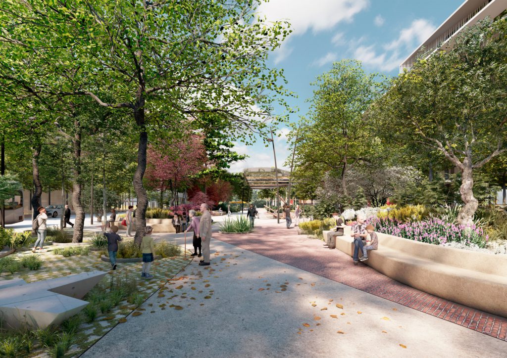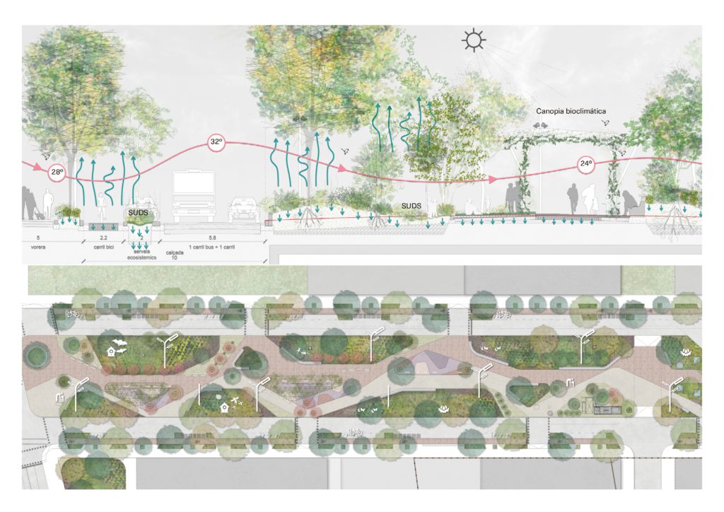 Además, se consideran las demandas infraestructurales derivadas del nuevo desarrollo urbanístico, la nueva instalación del District Heating and Cooling y la nueva Estación del AVE en Sagrera. Se propone la implementación de Sistemas Urbanos de Drenaje Sostenible (SUD’s) y nuevas pérgolas fotovoltaicas para mitigar parcialmente la huella de carbono de la actuación. Todo esto se complementa con un diseño de espacios verdes que minimiza el consumo de agua y favorece el óptimo desarrollo radicular de las especies vegetales mediante suelos estructurales. En este proyecto, se incorporan estrategias para hacer frente a los efectos del cambio climático como un aspecto fundamental del diseño.