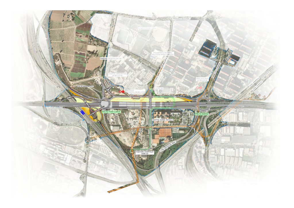 El proyecto constructivo del soterramiento de la Gran Via entre Rambla Marina y el rio Llobregat da continuidad al soterramiento ejecutado previamente entre la Plaça Cerdà y la Rambla Marina.