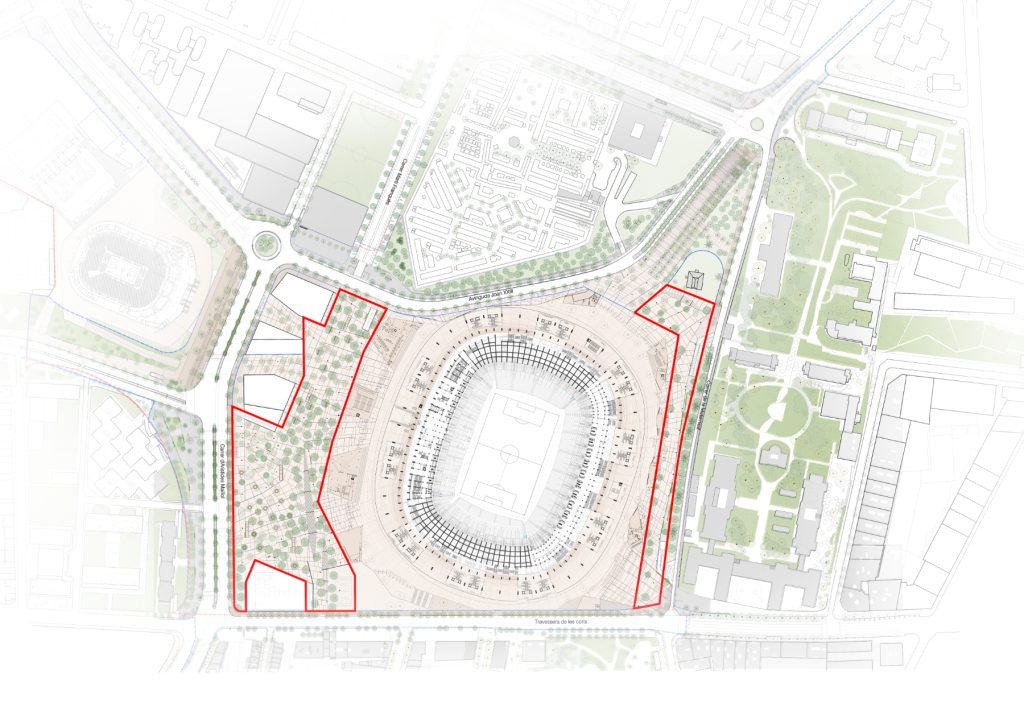 El Campus Barça, comprende específicamente el área peatonal y los accesos al estadio, calificados como suelo privado de uso público según el MPGM. Esta zona inicialmente inaccesible al público general y compuesta por terrazas destinadas a aparcamientos en superficie se transformará en un espacio público con uso diferenciado en días de partido.
